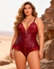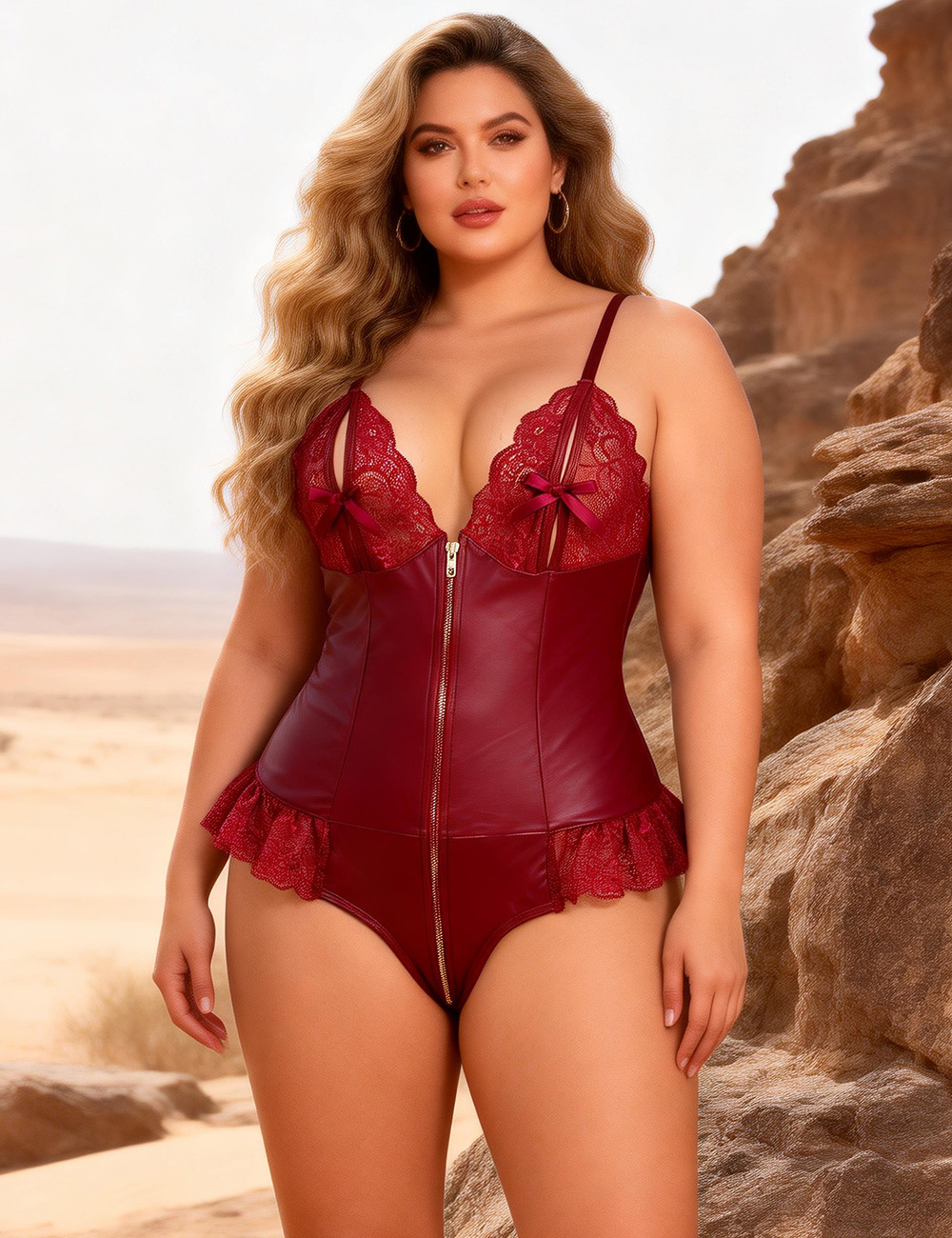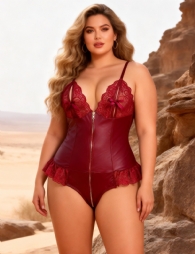 Home > Wholesale Plus Size Lingerie > Burgundy Sexy PU Leather Lace Zipper Bodysuit