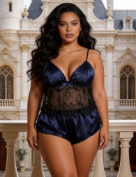Home > Plus Size Pajamas Supplier > Plus Size Hollow Sexy Sleepwear Satin Lace Splicing Pajama Sets