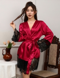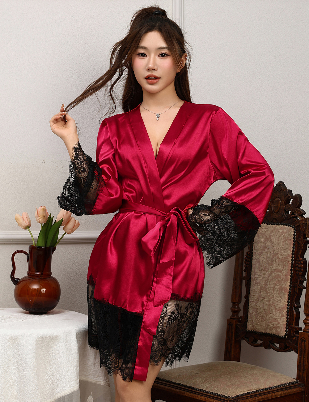 Product Name Red Elegant Sleepwear Silk Eyelash Lace Long Sleeves Nightdress With G String