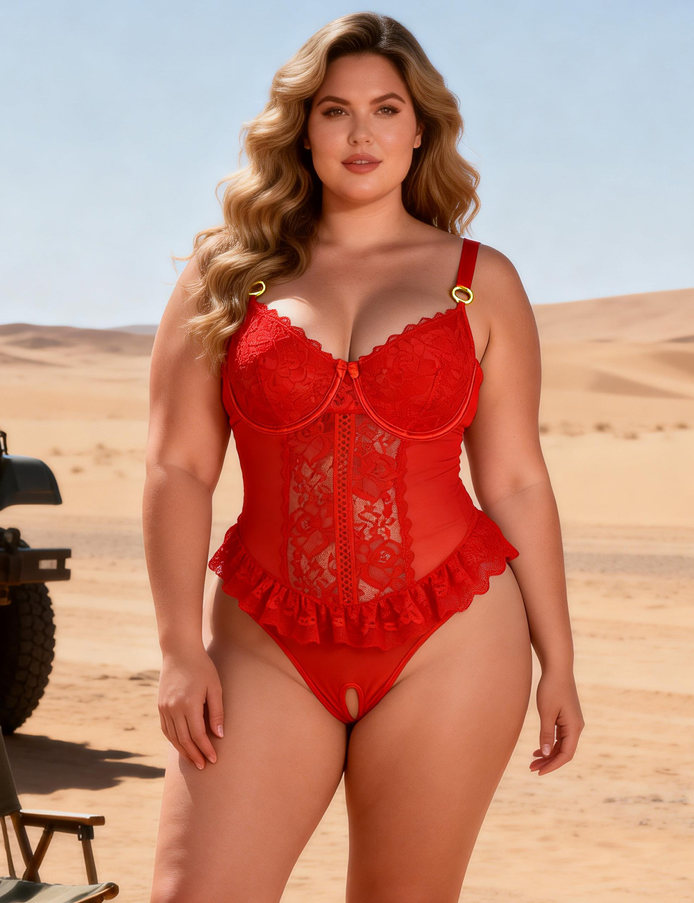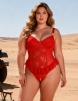 Home > Plus Size Teddy Supplier > Red Lace Mesh Halter Neck U Shape Backless Ruffled Crotchless Bodysuit