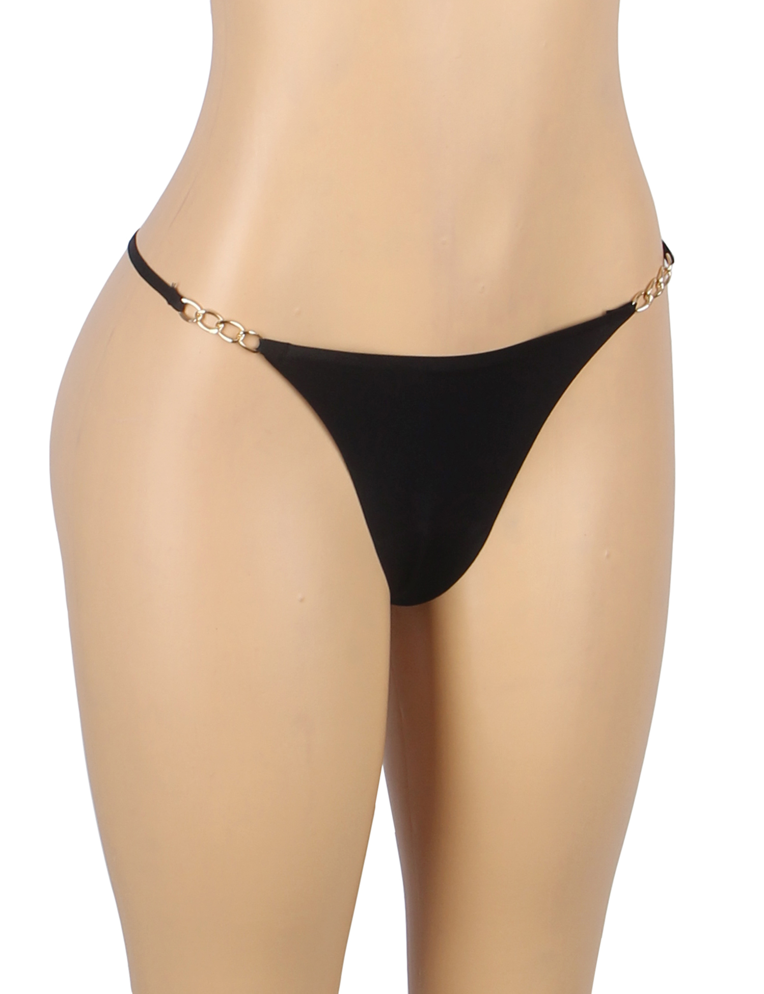 Standard product name: Available in black, white, and nude colors, ice silk fabric, gold chain splicing on both sides of the waistband, glue sticking process, sizes S-XL, women`s seamless chain ice silk thong