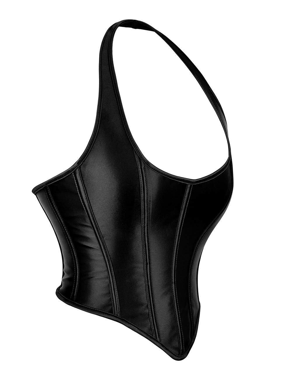 1. Satin fabric with a bright color; 2. Equipped with 13 soft bones for even force distribution; 3. Cross-back strap design with internal padding for aesthetics and comfort; 4. Halter neck design, fashionable and generous; 5. Short vest style, sexy and unique;