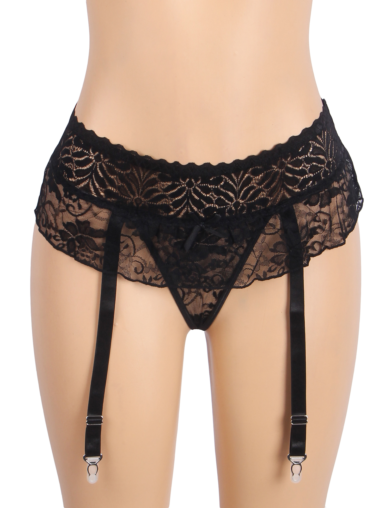 Standard Product Name: Available in black, white, and red colors, lace mesh, ruffled hem, 4 elastic suspenders, one-piece with hollowed-out back, size M-5XL plus size, women`s suspender panties.