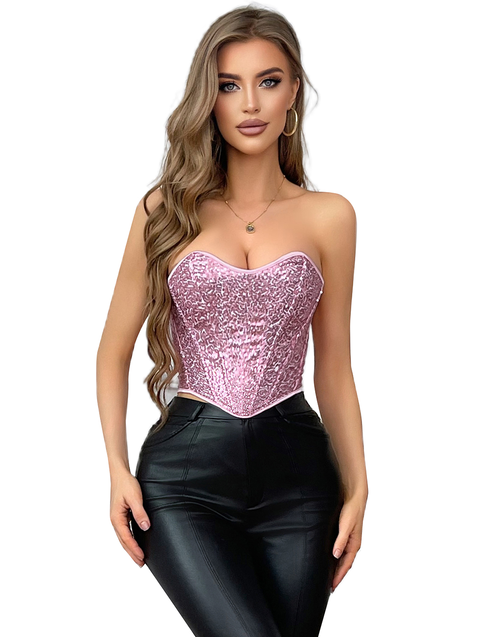 Home > Wholesale Corsets > 15 Pieces Plastic Bones Pink Sequined Palace Style Lace Up Corset