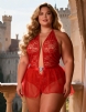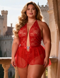 Home > Plus Size Teddy Supplier > Red Sexy Lace Mesh Halter Neck Open Crotch Teddy Lingerie 2PCS Set