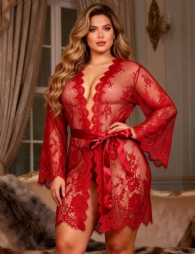 Product Name Sexy Plus Size Long Sleeve Eyelash Lace Short Red Sleepwear With Thong